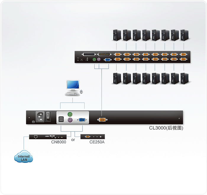 CL3000轻量型PS/2-USB双接口LCD控制端,为一款整合式KVM(键盘、显示器、鼠标)控制端,可作为KVM多电脑切换器的前端控制端使用。
