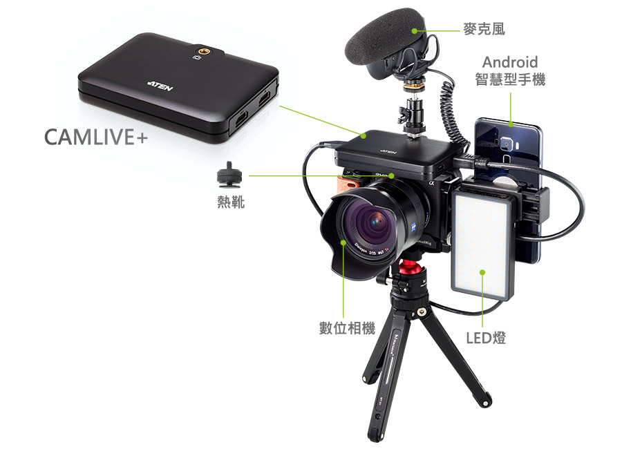 携带大量重型设备进行专业级移动直播,一直是影音内容创作者的痛苦。 藉由轻巧设计和热靴适配器的搭配,CAMLIVE™+ 可以安装在相机顶部或相关设备上,而且整体设置干净利落。另外,还可以额外加装麦克风和LED灯,以提高创作质量。